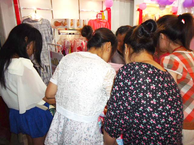 快来这边看!还有这么多热情的顾客,有的认真挑选产品;有的积极试穿;有的在收银台等着买单!
