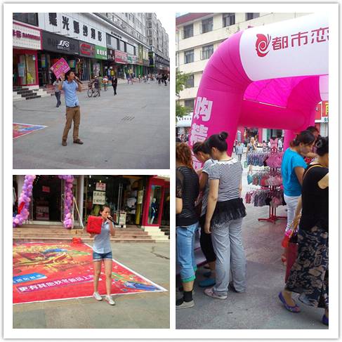 活动当天我们提前1小时精心布置外场,外场是我们活动的主题、招牌,也是最吸引人的。首先铺上喜庆的大红色地胶,撑起海报、展架,在地胶和门口正方向。拉横幅,挂气球拱门,摆礼品。四角拱门一定要有显眼的促销字体,以价格最低来吸引顾客。正门口处需要有“秋款新品,全场五折起”的红纸海拔。夏款睡衣一律9折,断码文胸7折,吊带+短裤8.8折,单件9折。就这样我们活动开始了。。。